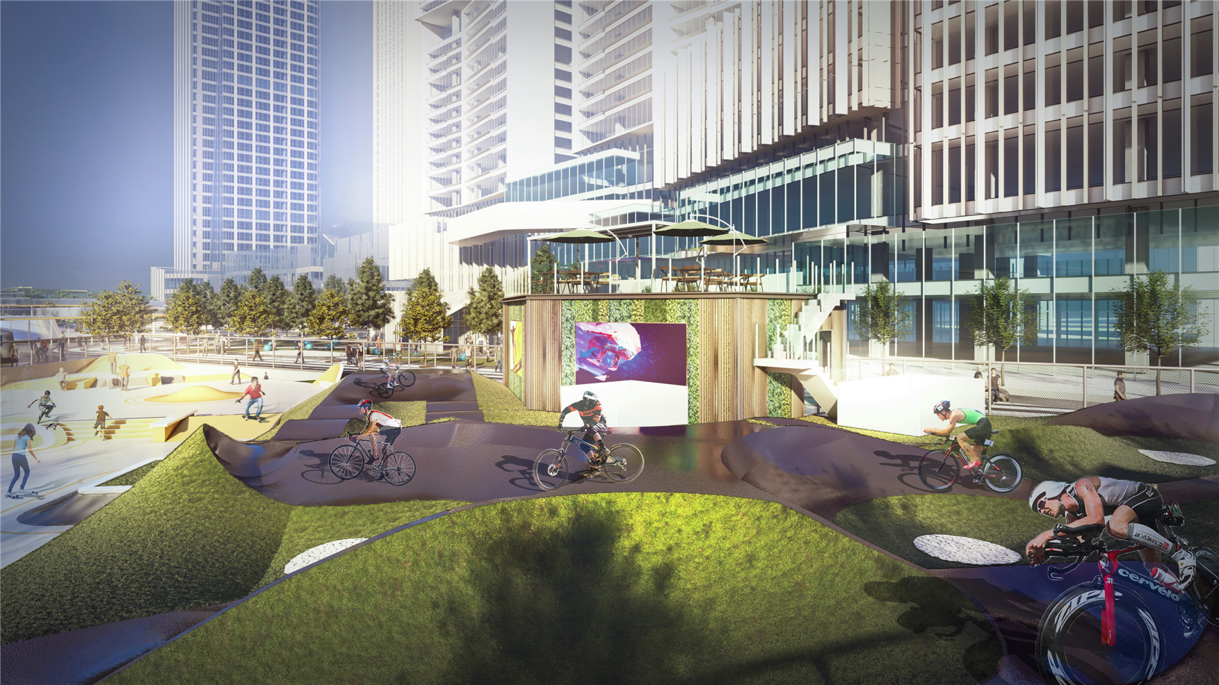 項(xiàng)目周邊以居住用地為主,緊鄰集中式商業(yè)綜合體及學(xué)校,是成都市三環(huán)內(nèi)唯一的一條專業(yè)級瀝青汞道,針對少兒平衡車項(xiàng)目進(jìn)行專項(xiàng)培訓(xùn)和組織賽事活動,功能齊全,視覺效應(yīng)好,形成打卡地效應(yīng)。 根據(jù)道具難度,以及場地地塊的形狀等綜合因素評判,滑板場地可定義為標(biāo)準(zhǔn)型場地 ,泵道目前能滿足國內(nèi)專業(yè)級比賽需求。最終打造出專業(yè) B 級的pumptrack 泵道 + 混凝土滑板公園,承載國內(nèi)一般性比賽 稀缺性、多維度受眾、網(wǎng)紅打卡、影響力的新氧運(yùn)動公園。